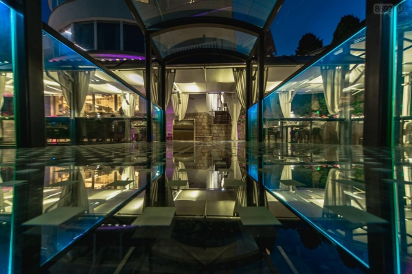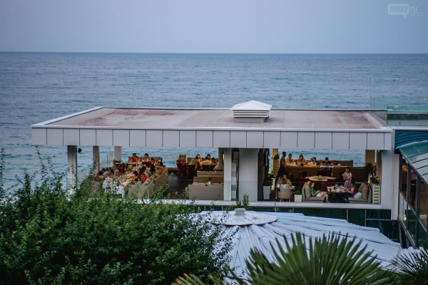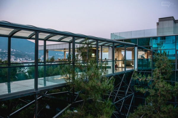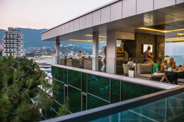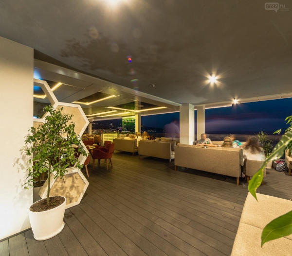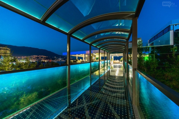Фактуры натурального дерева и камня здесь соседствуют с мягкими формами уютных манящих диванов, а все отделочные материалы подобраны так, чтобы сохранить и подчеркнуть тему близости к настоящей природе. Так, панели и перегородки лаунжа выполнены в виде сот из плит натурального мрамора по эксклюзивному дизайну. А для ярких впечатлений и удобства гостей создан уникальный для Крыма стеклянный мостик. Прозрачная конструкция, разработанная компанией FRANDGULO, выполнена из специальным образом закаленного стекла, в том числе и гнутого, и выглядит невесомым легким элементом, хотя и обладает высокой прочностью и надежностью.