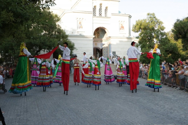 На протяжении всего вечера на площади выступали лучшие творческие и национальные коллективы города, театр на ходулях и живые статуи. У каждого храма экскурсанты смогли ознакомиться с обычаями и традициями народов, населяющих Евпаторию.