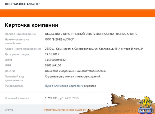 Из примечательного. В 2015 году отменена как ошибочная первичная регистрация ООО «Бизнес Альянс» в Симферополе по ул. Козлова, д. 45-а. Это здание ранее принадлежало структурам Андрея Сенченко и до сих пор памятно симферопольцам как крымский офис Блока Юлии Тимошенко, но было национализировано в 2014-м – сейчас здесь располагается Республиканский медиацентр, министерство внутренней политики, информации и связи РК и несколько подведомственных ему предприятий.